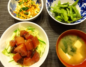 かつおの漬け丼にんじんとニラのしりしり枝豆お豆腐とほうれん草の味噌汁 * * * * * * * * * * * * *肉団子小松菜入り出汁巻き卵ごぼうとにんじんの塩麹きんぴら枝豆 * * * * * * * * * * * * *