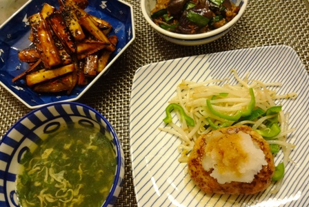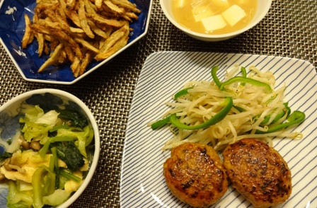 大豆入り豚つくね&もやしとピーマン炒めキャベツと小松菜の煮浸しごぼうの唐揚げ 明太子和え豆腐とえのきの味噌汁 * * * * * * * * * * * * *