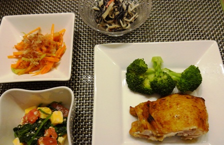 チキンのオーブン焼きほうれん草とトマト、チェダーチーズの塩麹和えにんじんとセロリのきんぴら大根とひじき、かにかまのごまマヨ和え * * * * * * * * * * * * *豚肉のえのき巻き照り焼きなすとピーマンの味噌炒めにらとちくわの塩麹炒め * * * * * * * * * * * * *
