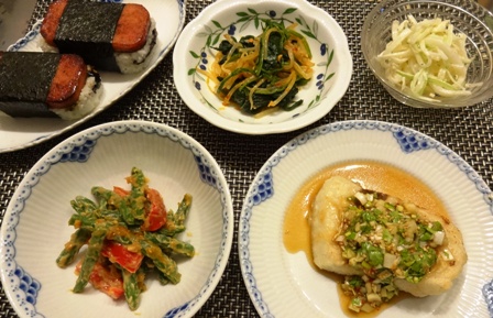 かじきまぐろのエスニックソースいんげんとパプリカのピーナッツバター和え大根とセロリのサラダほうれん草ともやしの食べラー和えスパムむすび * * * * * * * * * * * * *ソテーしたかじきまぐろに、ナンプラーやスイートチリソース、みじん切りの香味野菜などを混ぜたソースをかけました。ちょっと目先が変わって、おいしかったです♪スパムむすびはスパムを焼きつけてから、お醤油とみりんで甘辛く味付けし、ごはん→海苔の佃煮→ごはんの順に重ね、スパムをのせて海苔で巻いて完成甘辛味のスパムがごはんにピッタリ