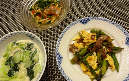 牛肉とアスパラのオイスター炒めあじのお刺身サラダ青梗菜とホタテのクリーム煮 * * * * * * * * * * * * *鶏肉の照り焼きブロッコリーとプチトマトのチーズ焼きほうれん草とコーンのバター炒めごぼうの明太子和え * * * * * * * * * * * * *