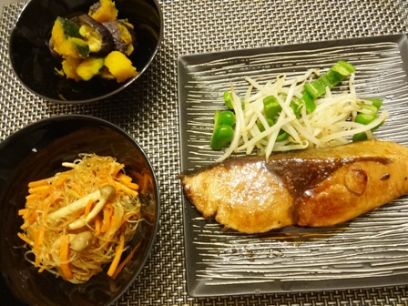 ぶりの洋風照り焼き&もやしとピーマンの塩炒めにんじんと春雨、しめじの炒め物なすとかぼちゃの蒸しいため * * * * * * * * * * * * *