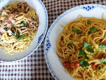 以下カルボナーラとしめじ、ほうれん草の明太マヨスパゲッティ。生クリームが少ししかなかったので、カルボナーラが二人分になってしまい、あとは冷蔵庫にあるもので二人分のパスタを追加しました。