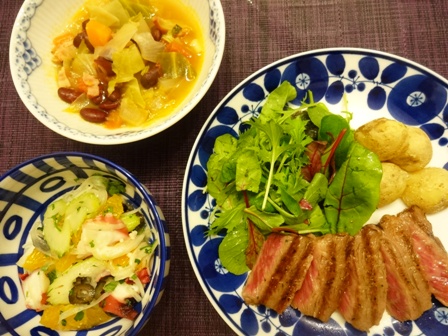 今日は娘の入学式でした。昨日、ロピアで和牛のステーキ肉を買ってきたので、今日はそれをメインにお祝いメニューです。息子も入学式はなかったものの、昨日高校に入学したので、一緒にお祝しました。こちらは「ザブトン」という部位らしいです。トロみたいな脂のノリ!こちらは「クリ」という部位のステーキ。ロピアはお肉屋さんから発展したスーパーらしく、お肉の種類が豊富で、見ているだけでも楽しかったー。サイドメニューは、タコのマリネとキドニービーンズ入りのミネストローネ。タコのマリネはてんきち母ちゃんレシピです。デコポンや新玉ねぎ、セロリ、ブラックオリーブが入ってうまみたっぷり。