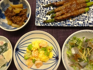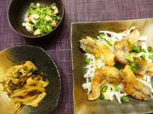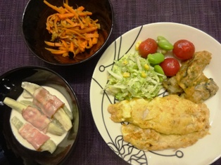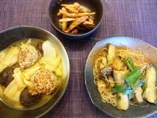 白菜と肉団子の煮物豚コマとなす、ニラの春雨炒めゴボウの唐揚げ たらこ和え * * * * * * * * * * * * *塩昆布入り合挽き肉のつくねさつま揚げとにんじんのきんぴらキャベツのゆかり和え * * * * * * * * * * * * *