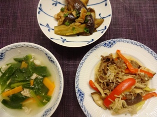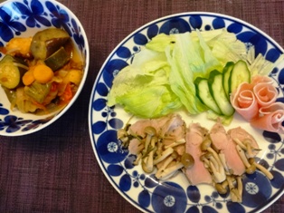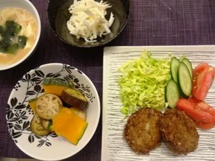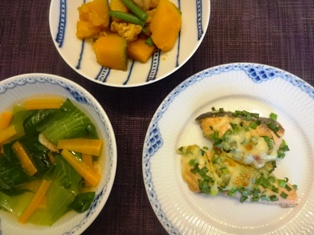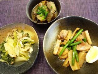 れんこんと鶏肉の煮物キャベツと小松菜の煮浸しなすの味噌煮 * * * * * * * * * * * * *