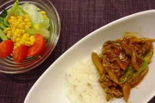牛肉ときのこの炒めサラダなすと豚肉のガーリック梅ポン酢炒め小松菜とにんじんのスープ * * * * * * * * * * * * *まだまだ春休みが続く我が家。本日のお昼は、豚ひき肉と野菜を炒め、オイスターソースで味付けしたエスニック風ごはん。