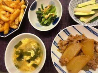 大根と豚肉の煮物小松菜と油揚げの醤油炒め長芋とズッキーニの蒸しいため ぽん酢がけチーズトッポッキワカメと卵、新玉ねぎの味噌汁 * * * * * * * * * * * * *インターネットエクスプローラーを使わないほうがいいという報道を受け、パソコンには他のブラウザをインストールしてはいるのですが、とりあえず携帯からアップしてみました。この日は最初の予定ではトッポッキはなかったのですが、出来上がったメニューを見ると、なんだかボリューム不足。冷蔵庫で場所を取っていたトックが目についたので、他のメニューとは全くバランスとれていませんが、急遽トッポッキを作りました(*^^*)トックとさつま揚げを炒めて、コチュジャンや水あめで味付けし、最後にピザ用チーズを絡めて完成♪即興メニューにしては美味しく出来て、大満足(^o^)/