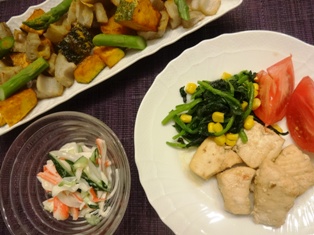 かじきまぐろのチリソースマリネ焼きほうれん草とコーンのソテー&トマトかにかまときゅうり、新玉ねぎのサラダれんこんとかぼちゃ、アスパラの素揚げ カレー塩和え * * * * * * * * * * * * *かじきまぐろをチリソース&お醤油を合わせたものに漬け込み、フライパンで蒸し焼きにしました。