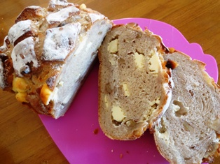 富澤商店のレシピです。ライ麦入りのカンパーニュ生地にローストしたくるみとちぎったクリームチーズを加えて蒸気焼成しました。