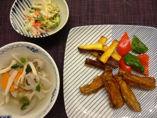 手羽中の甘辛揚げ さつまいもとピーマンの素揚げ新玉ねぎとかにかま、きゅうりのサラダ根菜スープ * * * * * * * * * * * * *