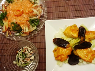 サーモンのカルパッチョ鶏むね肉のコチュマヨ焼き なす&ゆでキャベツ添え大根とかにかま、ひじきのごまマヨ和え * * * * * * * * * * * * *今日は会員になっている友達にコストコに連れて行ってもらいました♪近所ではなかなか安く買えない乳製品が、かなりお買い得!クリームチーズ、チェダーチーズ、マスカルポーネチーズ、バターをそれぞれ800g~900gずつの大量買い(#^.^#)そして、コストコへ行くと必ず買うのがサーモンのお刺身とエビと鶏肉(*´∀`*)今日はサーモンを薄切りにして、たっぷりの野菜と盛り合わせ、カルパッチョ風にしていただきました。8枚入りの鶏むね肉は、2枚を酒蒸しにして冷凍、2枚を鶏ハムに、2枚はそのまま冷凍し、残りは今日の夕食に。コストコの鶏肉は、むね肉なのに、とてもジューシーで柔らかく仕上がります(^o^)