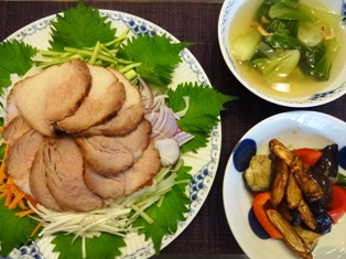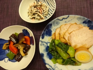 ローストポーク&千切り野菜なすとピーマン、ごぼうの揚げ浸しチンゲン菜と桜エビのスープ * * * * * * * * * * * * *ローストポークはてんきち母ちゃんのレシピです。前日からはちみつとお醤油のたれに浸しておいた豚肩ロース肉をフライパンで焼き目をつけてから、オーブンへ。30分ほど焼いてからアルミホイルで包んで余熱で火を通します。ローストポークはどうしても火の通りが心配で硬くしてしまいがちなのですが、この方法だと、しっとりジューシーでやわらかな焼き豚になりました(*´∀`)ノ