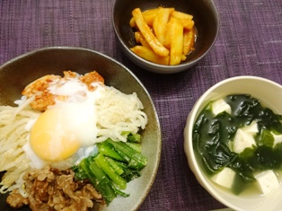ビビンバじゃがいものコチュジャン和えわかめスープ * * * * * * * * * * * * *夫、飲み会の日にしょっちゅう登場するメニュー^^;野菜もたくさん取れるし、洗い物のも少ないし、そして何より子どもたちの食べっぷりもイイ午前中は仕事をして、帰宅後、大急ぎでお昼を作って食べさせ、午後は娘の学校のプール開放だったので、車で送迎し、待ち時間にテニススクールに行き、汗だくのまま再び娘を学校までお迎えに行き、帰宅。そしてまた夕食作り夏休みは、本当に母親にとってはちっとも休みじゃない…(+_+)