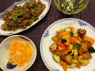 鶏肉とカシューナッツの炒め物牛肉と紫玉ねぎのマリネ塩レモン入りにんじんラペほうれん草とツナのオイマヨ和え * * * * * * * * * * * * *いつもの鶏肉とカシューナッツの炒め物に、ズッキーニやパプリカなど夏野菜をたっぷり加えて、夏バージョンにしました。鶏肉は1枚しか使っていないので、肉っけが足りなさそうな息子用に、牛肉のマリネも。我が家の塩レモンもようやく完成。生のレモンとは違った、独特の香りがしています♪まだ使いこなせていないので、これから研究する予定。