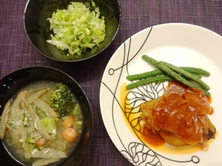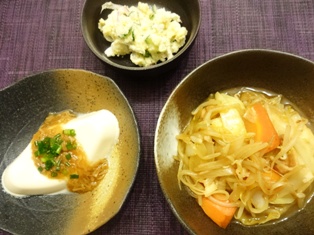 キムチ肉じゃが大根とセロリ、帆立のサラダなすのナムル豆もやしとあさりのスープ * * * * * * * * * * * * *