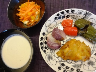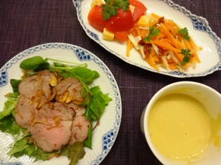 ハーブローストポークにんじんとえのき、ドライトマトのマリネ焼きパプリカとチーズのマリネとうもころしのポタージュ * * * * * * * * * * * * *豚肩ロース肉を前日からハーブ類やはちみつ、お醤油などに漬けこみ、当日はオーブンで焼くだけ。30分くらいローストした後、アルミホイルで包んで保温して余熱で火を通します。しっとり柔らかくて食べやすいローストポークの出来上がり(*´∀`)ノ 生のとうもろこしが出回るシーズンですが、我が家では蒸しただけのとうもころしだとイマイチ人気がない(-_-;)食べるのが面倒くさいらしいです…(@_@;)そこで、せっかくの甘いとうもろこしを味わうべく、せっせとポタージュにしています。一度蒸してから、玉ねぎと一緒にバターで炒めてミキサーにかけています。調味料は塩・こしょう程度ですが、びっくりするほど甘~いポタージュに。冷たくしても美味。ポタージュのカップは、先日軽井沢のアウトレットで購入したもの。ちょうどセールの時期で、半額くらいで買えました♪