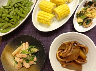 コチュジャン風味のいか大根小松菜と豚肉、きくらげの卵炒め長芋と三つ葉のたらこ炒め枝豆&とうもろこし * * * * * * * * * * * * *いつものわた入りいか大根にコチュジャンを加えてみました。さらにコクがアップして、ごはんが進む味です。