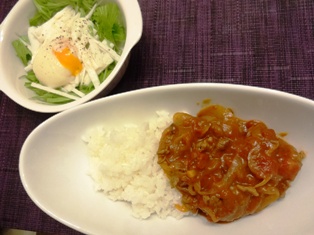 焼肉のたれでハヤシライス水菜と長芋の温玉サラダ * * * * * * * * * * * * *昨日旅行先の軽井沢から帰宅。帰りは関越が結構渋滞して、帰宅が遅かったのですが、今日は朝から仕事(・・;)息子は部活、娘はお弁当持ちでデイサービスとバラバラな一日でした。仕事が夕方まであり(←しかも高3生ばかり)、夫は飲み会だったので、超簡単なスピード晩ごはん…^_^;旅行前に焼いて冷凍保存してあったけしの実のパン。バターをのせて焼いてあるので、ほんのり塩気があって、夏においしいパンです♪