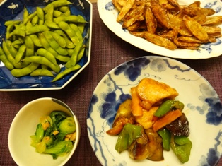 酢鶏チンゲンサイと干しエビのお浸しごぼうのピリ辛から揚げ枝豆 * * * * * * * * * * * * *夏休みも本番!お昼ごはん作りも続いています…(-_-;)今日は子ども達の好きな冷やしうどん。具はなすやにんじんの入った野菜たっぷりの肉みそです。紫たまねぎときゅうりも添えてさらにかさ増し!うどんは最近では3人で3玉では足りないので、4玉使いました。