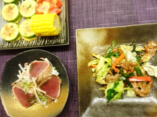 牛肉とキャベツのオイスターソース炒めかつおのたたきサラダホバクとパプリカのジョン * * * * * * * * * * * * *近所のスーパーの韓国フェアで、普段は手に入らない韓国かぼちゃ(ホバク)を発見!かぼちゃという名前はついていますが、見た目はズッキーニに似ています。小麦粉をはたき、卵液をくぐらせて焼きました。さいたかにかまや万能ねぎ、ごまをのせて彩りよく