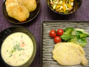 鶏むね肉のソテー ほうれん草&アンチョビソースかぼちゃのサラダ大根とかきのステーキ * * * * * * * * * * * * *本日の朝ごはん。ゴルビージャックチーズ入りパンとオリーブブレッドに、ブルサンのハーブ入りチーズを添えました。ヨーグルトとマスカルポーネチーズを同量ずつ混ぜて、はちみつで甘みをつけ、フルーツをトッピングしたもの。
