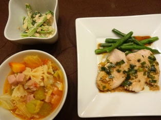 オリ醤でしっとり鶏ハムミネストローネ小松菜とツナのオイマヨ和え * * * * * * * * * * * * * いよいよ冷蔵庫のお掃除も大詰め的なメニュー^m^鶏むね肉をオリ醤に漬け込んでから、表面をフライパンでさっと焼き、あとはふたをしてじっと待つこと20分。余熱でじわじわ火を通すことで、むね肉もパサつかず、しっとりいただけます♪仕上げにもオリ醤をまわしかけ、万能ねぎを散らしました。
