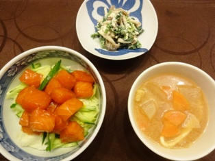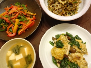 れんこん入り鶏つくね白菜とがんもどきの煮物さつまいも、ピーマン、なすの揚げおろし煮 * * * * * * * * * * * * *
