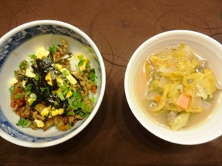 さばそぼろ豚汁 * * * * * * * * * * * * * 仕事が佳境に入り、夕食は朝のうちに準備して、息子に配膳を頼んで、出掛けました