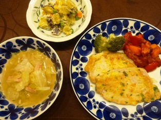 ポークピカタにんじんとパプリカのトマト煮 ゆでブロッコリー キャベツとベーコンのカレー風味スープさつまいもとミックスベジタブルのサラダ * * * * * * * * * * * * *