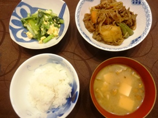 仙台麩入り肉じゃが小松菜の卵炒めお豆腐となめこの味噌汁 * * * * * * * * * * * * *