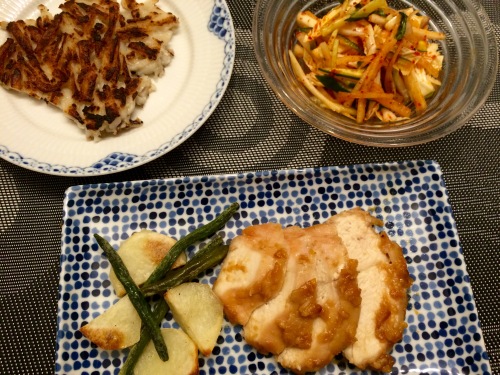 ゆず茶チキンじゃがいも&いんげんれんこんガレット生白菜のキムチ ********************* チキンをゆず茶とお醤油につけてオーブンで焼きました。付け合わせの野菜も一緒に、オーブン焼き。 先日新大久保の「おんどる」で買って来た、友人オススメの生白菜のキムチの素。サラダ以外にもいろいろ使えそうで、楽しみです♪
