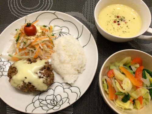 ハンバーグ温野菜サラダコーンスープ ******************* 今日は夫が出張でいないので、母子3人の晩ごはん。友達が作っていて気になっていた、某ファミレス風のハンバーグプレートにしてみました♪( ´▽`)←実際には行ったことないので、画像検索(笑) こちらはランチのうにクリームパスタ。楽天セールでお買い得のうにをたっぷり買ったので、贅沢に使ってみました♪