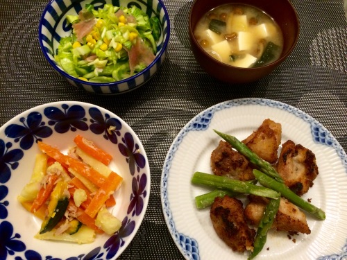 鶏肉の塩麹唐揚げにんじんとじゃがいものツナ&クリチ和えコールスロー豆腐となめこ、わかめの味噌汁 ****************