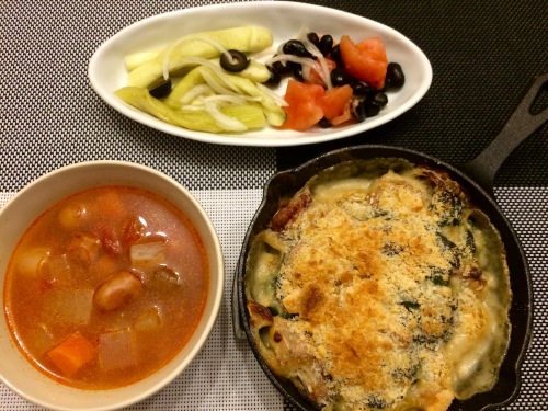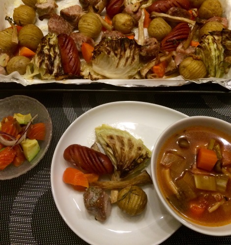 ぎゅうぎゅう焼きアボカドとサーモンのサラダ 野菜とウィンナのスープ ***************** 最近お気に入りのぎゅうぎゅう焼き。野菜もたくさん取れるし、オーブン任せでできるので、時間のない日にも便利です。