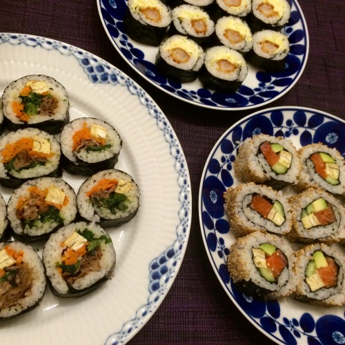 我が家の子供達は正統派の太巻きがあまり好きではないので、恵方巻きも毎年変わり種^^;ことしはプルコギキムパ、サーモンの卵黄漬けとアボカドを巻いた裏巻き、エビフライとキャベツの三種。