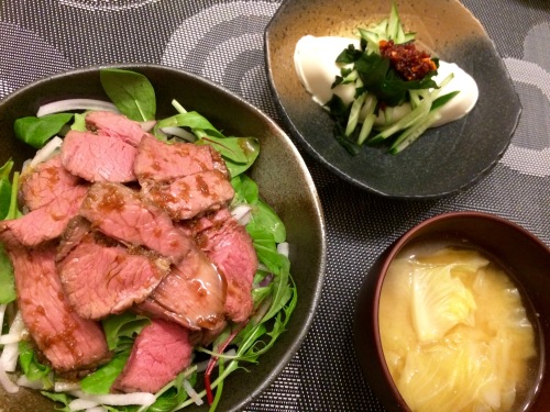 ローストビーフ丼きゅうりとわかめのっけの冷ややっこ食べラーがけ キャベツとじゃがいものお味噌汁 ****************