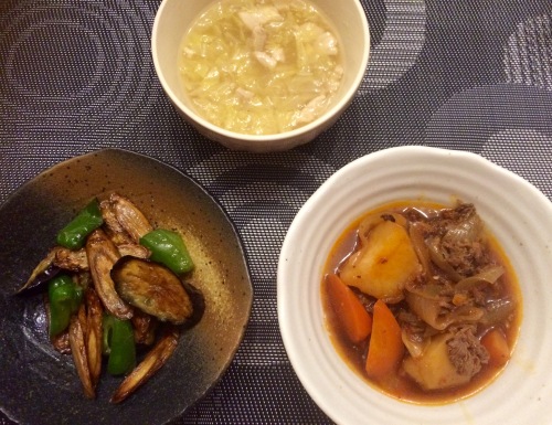 キムチ入り肉じゃが野菜の揚げ浸し白菜と豚肉のスープ ***************