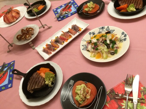 ヒレステーキ&ロマネスコ、にんじんのグラッセアボカドとスモークサーモンのサラダたことブラックオリーブ、オレンジのマリネパプリカとブロッコリースプラウトの生ハム巻きカマンベールチーズのベーコン巻き焼き 市田柿のクリームチーズ&くるみ詰め
