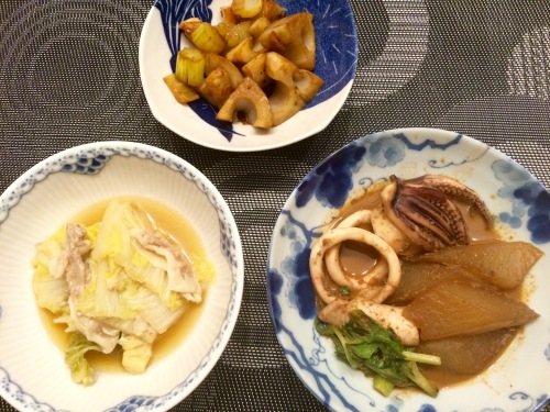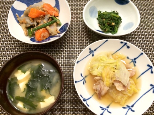 白菜と豚バラ肉の煮物根菜とツナの煮物春菊のピーナッツバター和え お豆腐とわかめのお味噌汁 ******************