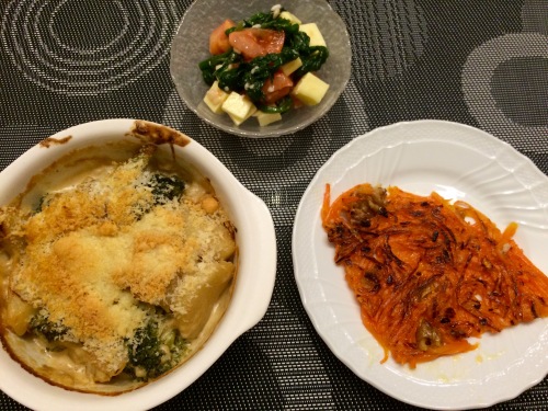 塩ダラとブロッコリーのグラタンにんじんとくるみのガレット ほうれん草とトマト、チーズの塩麹和え *******************