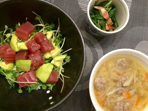 まぐろとアボカドの丼いわしのつみれ汁春菊とベーコンの炒め物 ****************** 夫飲み会につき、簡単晩ごはん♪ 豚肉の大葉チーズ巻き小松菜とにんじんのナムルかぼちゃの甘辛 ******************