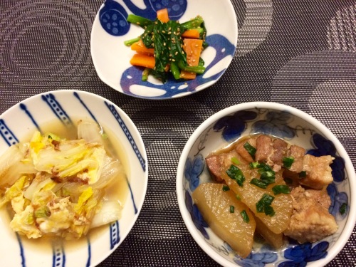 豚バラ肉と大根の煮物白菜の煮浸しにんじんと小松菜のナムル ***************** オレンジページのレシピです。朝下ごしらえをして、夕方仕上げるタイプの煮物特集。なかなか便利!