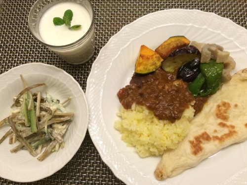 キーマカレー揚げ野菜添えサフランライス&ナンごぼうときゅうりのサラダラッシー *********************