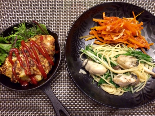 ひき肉とじゃがいものオムレツ牡蠣と水菜のガーリックパスタにんじんとえのき、トマトのサラダ ********************