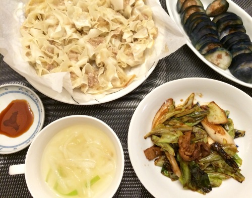 シューマイ回鍋肉大根とザーサイのスープなすのお漬物 **************** 息子作のシューマイです。とはいっても、今日は時間がなかったので、私が作ったたねを包んでもらっただけですが^^;それでも十分な戦力になってくれました
