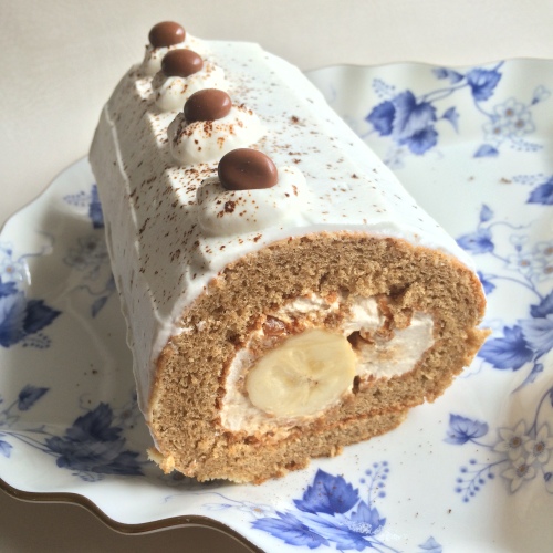 練乳とフリーズドライいちごパウダーを加えた生クリームと、いちごやバナナ、ブルーベリーなどを巻き込みました。