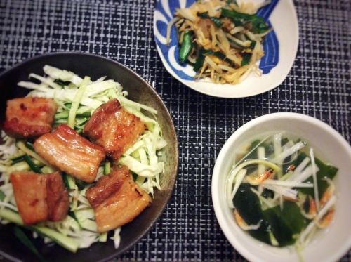 豚バラ丼桜海老とわかめのスープもやしとニラの卵炒め *******************