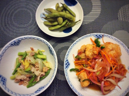 鶏肉の南蛮漬け白菜と豚バラ、アスパラの重ね煮枝豆 *****************
