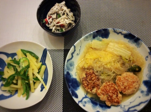 肉団子と白菜の煮物じゃがいもとピーマンの塩麹炒め大根とひじき、かにかまのごまマヨ和え *******************